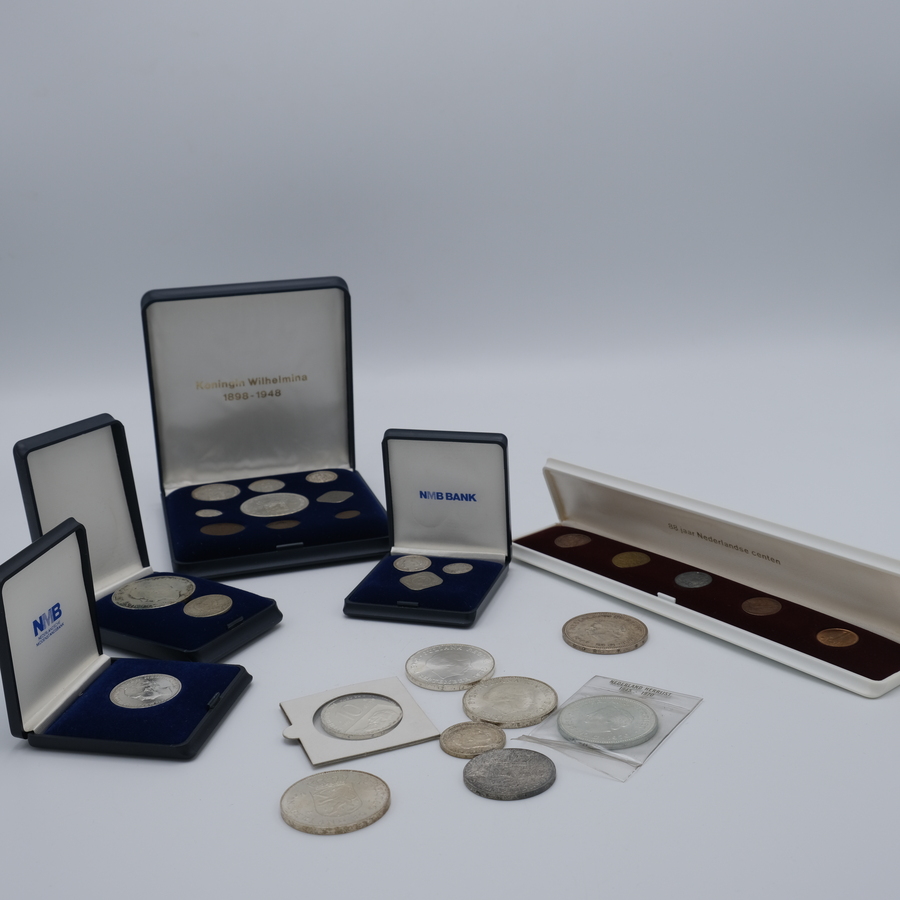 Lot divers 20e eeuws Nederlands muntgeld: een cassette ‘88 jaar Nederlandse centen’ met 5 centen, periode 1929-1980, een cassette Koningin Wilhelmina 1898-1948, een cassette met zilveren Gulden ...