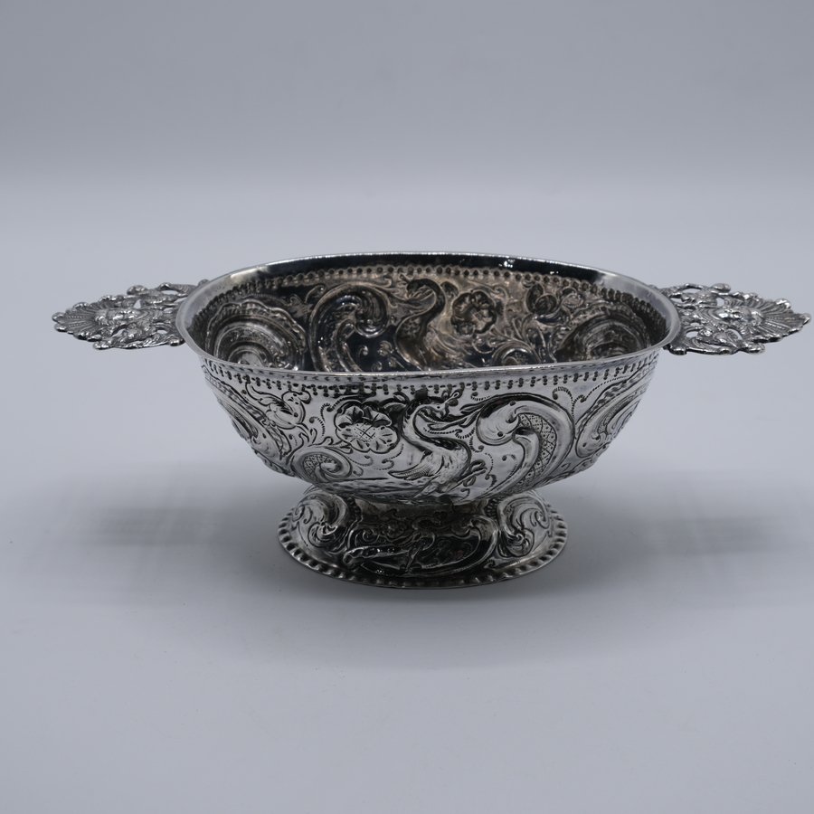 Zilveren brandewijnkom onder meer versierd met drijfwerk met pauwen, Sneek, anno 1791.