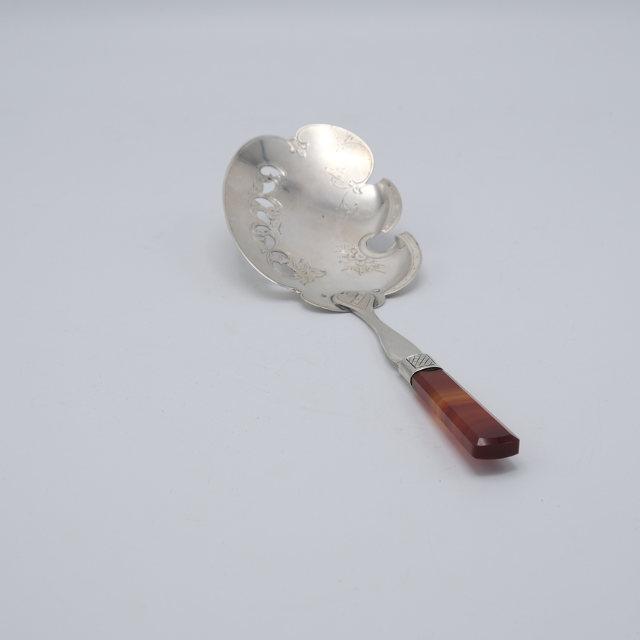 Een antieke tweede gehalte (835/1000) Hollands zilveren visschep. Jaarletter 1874, onduidelijk meesterteken (FLJ?)