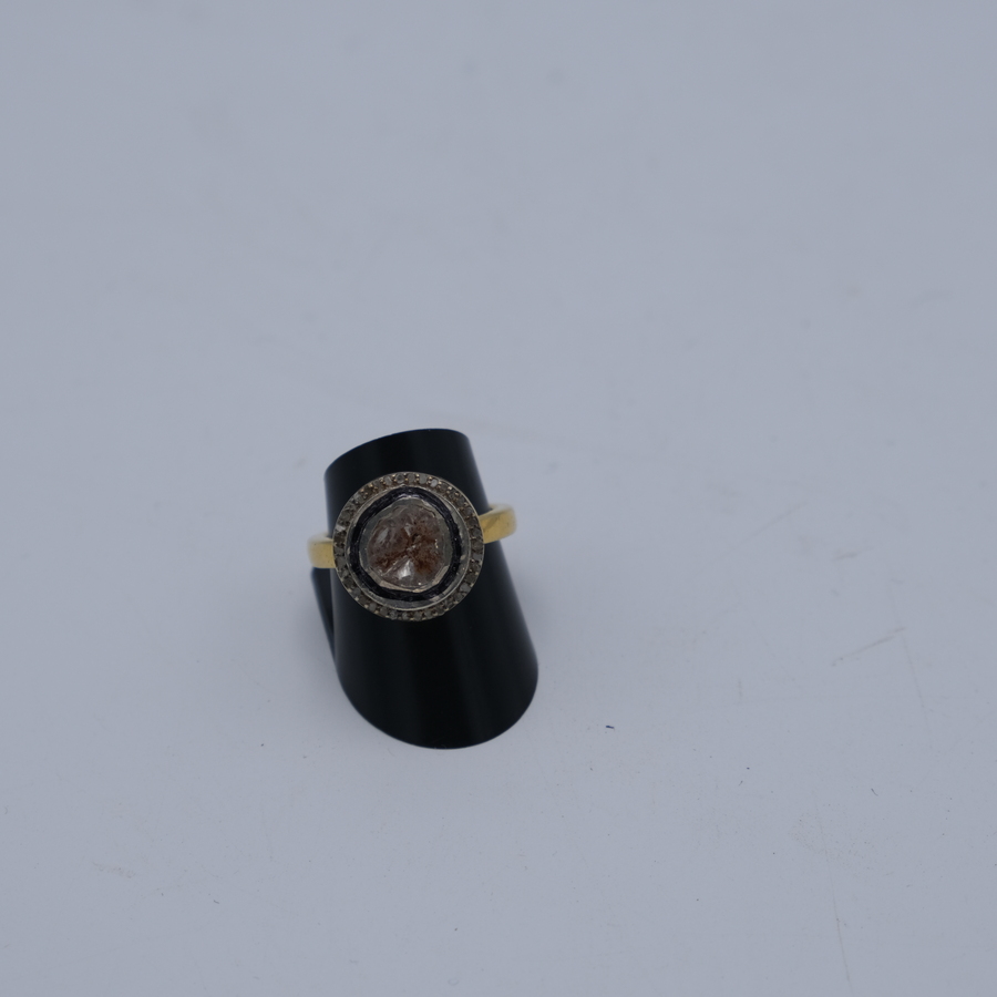 goud op zilver ring bezet met grote diamant en vele kleintjes.