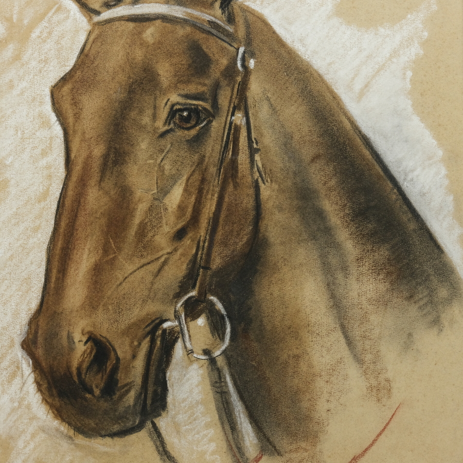 Krijttekening op papier, voorstelling van een paardenkop. Rechtsonder gesigneerd L. van den Berg, gedateerd 1932. Mogelijk een werk van Lando van den Berg (Wamel 1913 - Amsterdam 1962)