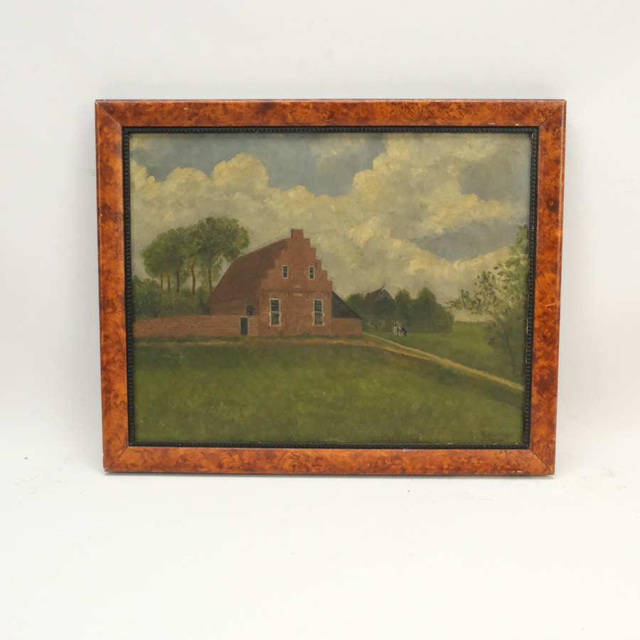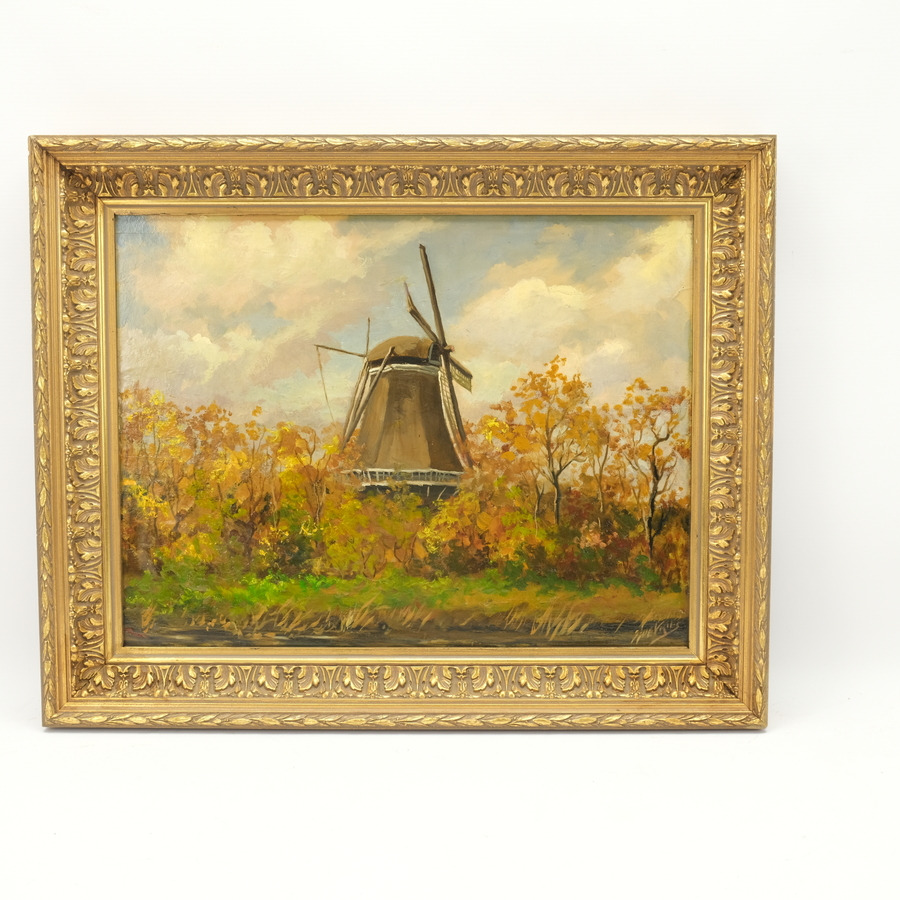 Schilderij, olieverf op paneel. Gezicht op Penninga's molen te Joure. Rechtsonder gesigneerd Sjoerd de Vries (Franeker 1909 – Alkmaar 1996)
