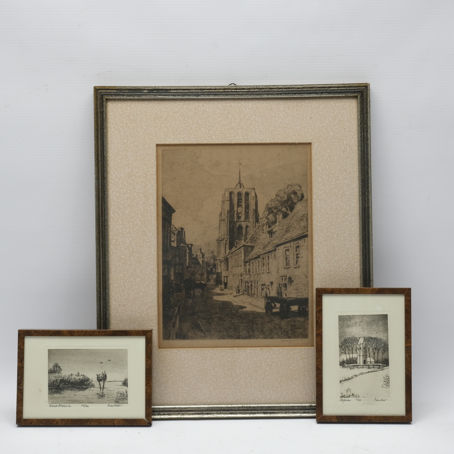 Lot van drie etsen: ‘Reidkraach’ en ‘Aegum’ door Piet de Vries, en een ets, Oldehove, door Waalko Jans Dingemans.