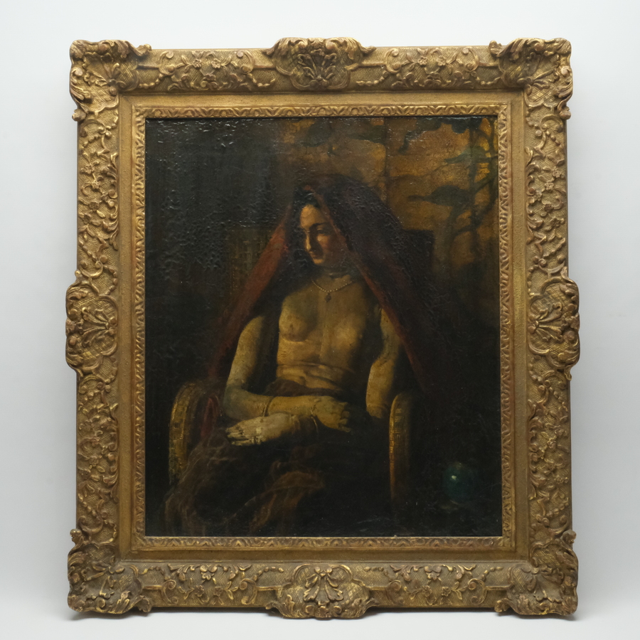 Schilderij, olieverf op doek in vergulde ornamentenlijst. Vrouw zittend op stoel bij een gemberpot, rechtsonder gesigneerd Arthur Briët (Madioen 1867 – Nunspeet 1939).