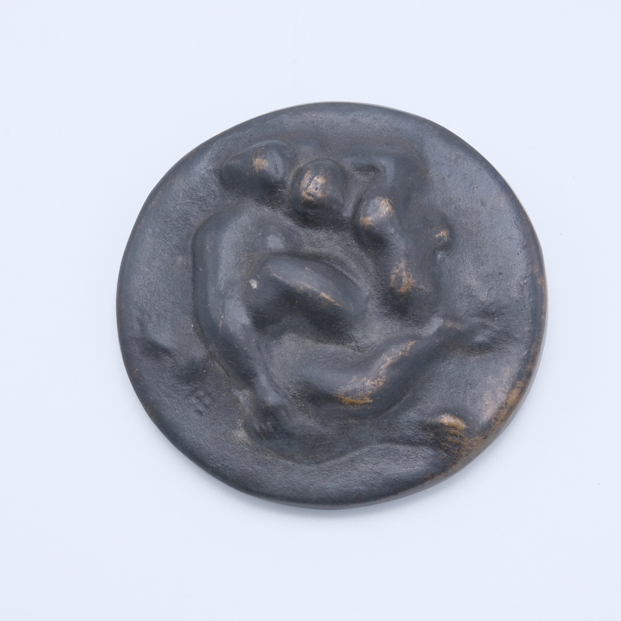 Een 20e eeuwse bronzen penning, met op de voorzijde voorstelling van een liefdespaar in omstrengeling en achterzijde en man en vrouw in labyrint. Titel 'le Couple', ontwerp Fons Bemelmans (Maast...