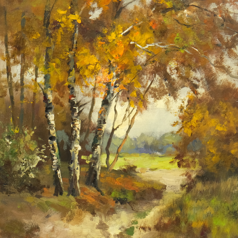 Schilderij, olieverf op doek. Herfstig bosgezicht. Linksonder gesigneerd Johannes Christiaan Klinkenberg (1852-1924), mogelijk een kopie naar Klinkenberg