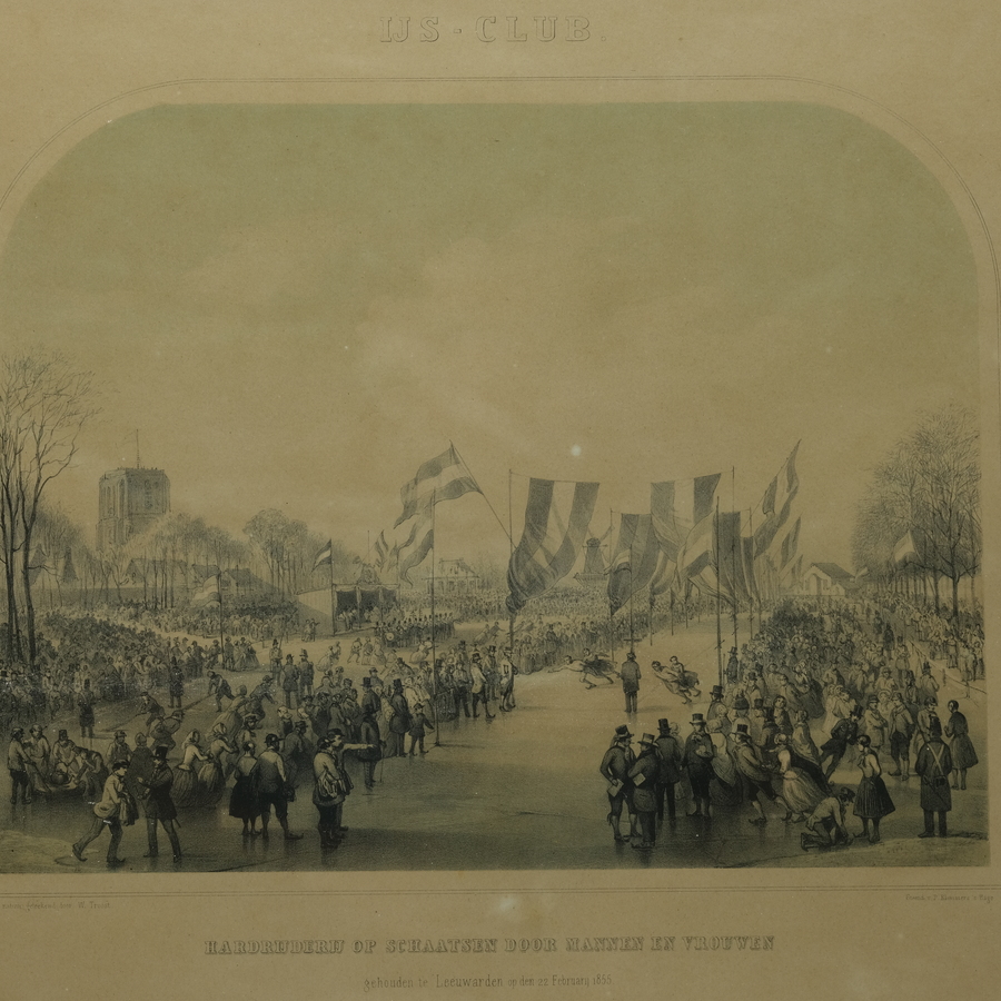 Een 19e eeuwse lithografie, ‘IJs-club’ en ‘Hardrijderij op schaatsen door mannen en vrouwen gehouden te Leeuwarden op den 22 Februarij’. Naar de natuur geteekend door W. Troost, steendruk van P....