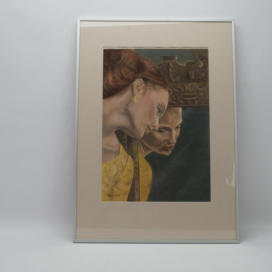 Krijttekening op papier. Portret van een vrouw kijkend in spiegel. Rechtsonder gesigneerd Truus Harmelink