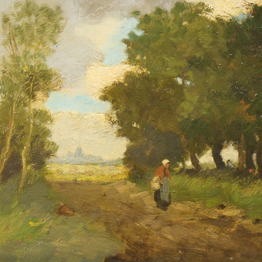 Schilderij, olieverf op doek. Vrouwtje op een zandpad. Rechtsonder gesigneerd Jacq. Witjens (Den Haag 1881 - Buenos Aires 1956).