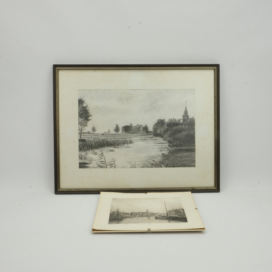 Lot van twee kunstwerken: een potloodtekening, sloot bij kerkdorp, ges. E van den Burg. Met daarbij een ets, gezicht op Lemmer 't Dok, gesigneerd Anna Doedijns