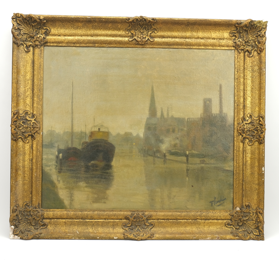 Schilderij, olieverf op doek. Havengezicht in impressionistische trant. Rechtsonder gesigneerd 'F. Landius' (?)