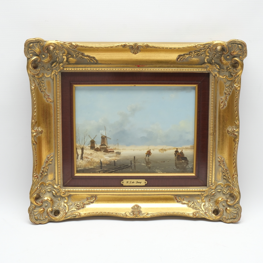 Schilderij, olieverf op paneel in vergulde ornamentenlijst. Winterlandschap met schaatsers en twee molens. Rechtsonder gesigneerd H.J. De Jong.