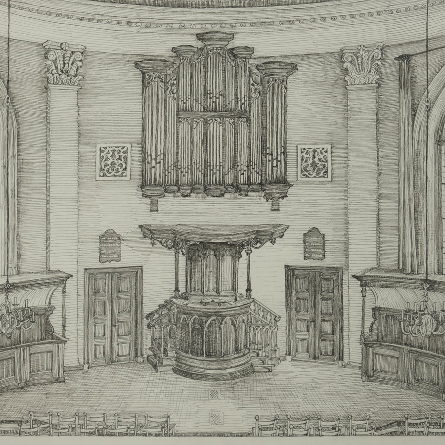 Pentekening op papier. Voorstelling van een kerkinterieur met preekstoel en orgel. Betreft de Doopsgezinde Kerk in Sneek. Linksonder gedateerd oktober 1977, rechtsonder gesigneerd Evert Posthuma...