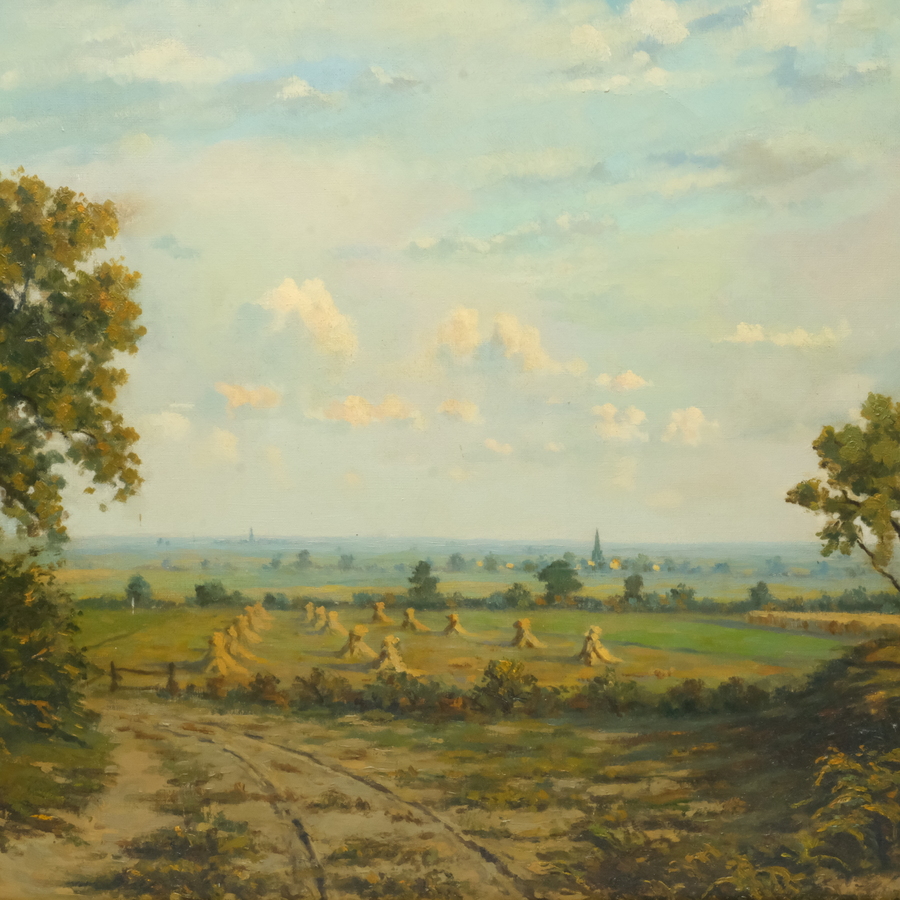 Schilderij, olieverf op doek cm in ornamentenlijst. Landschap met korenschoven. Rechtsonder gesigneerd Egbert van der Kolk (Zwolle 1915 – 1994).