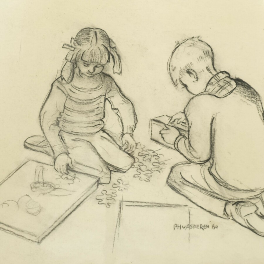 Tekening, houtskool/potlood op papier. Kleinkinderen van van Asperen. Rechtsonder gesigneerd Piet Hein van Asperen (Harlingen 1895 - Leeuwarden 1969), gedateerd 1964.