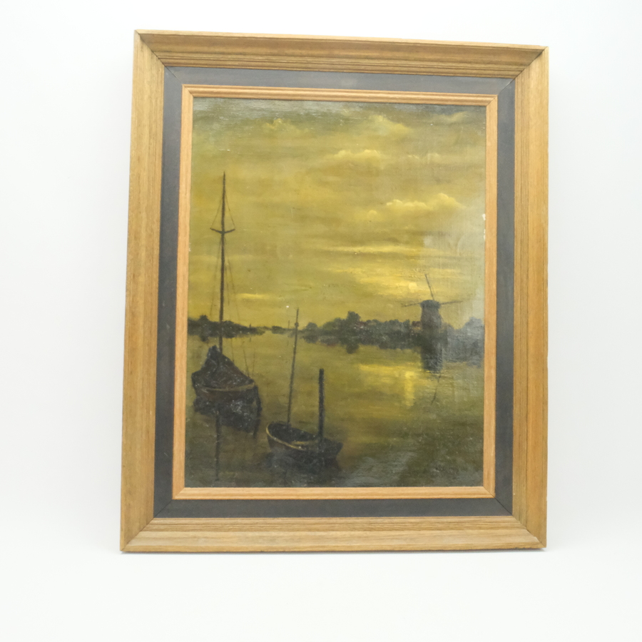 Schilderij, olieverf op doek. Boten bij het water bij zonsondergang. Kopie naar Ydema