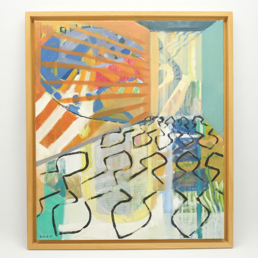 Schilderij, olieverf op doek. Abstracte compositie. Linksonder gesigneerd ‘Verkerk’, gedateerd 1996.