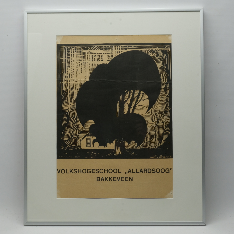 Affiche/houtsnede. ‘Volkshogeschool Allardsoog Bakkeveen’. Linksonder gesigneerd K.F. van der Wel – Doorn.