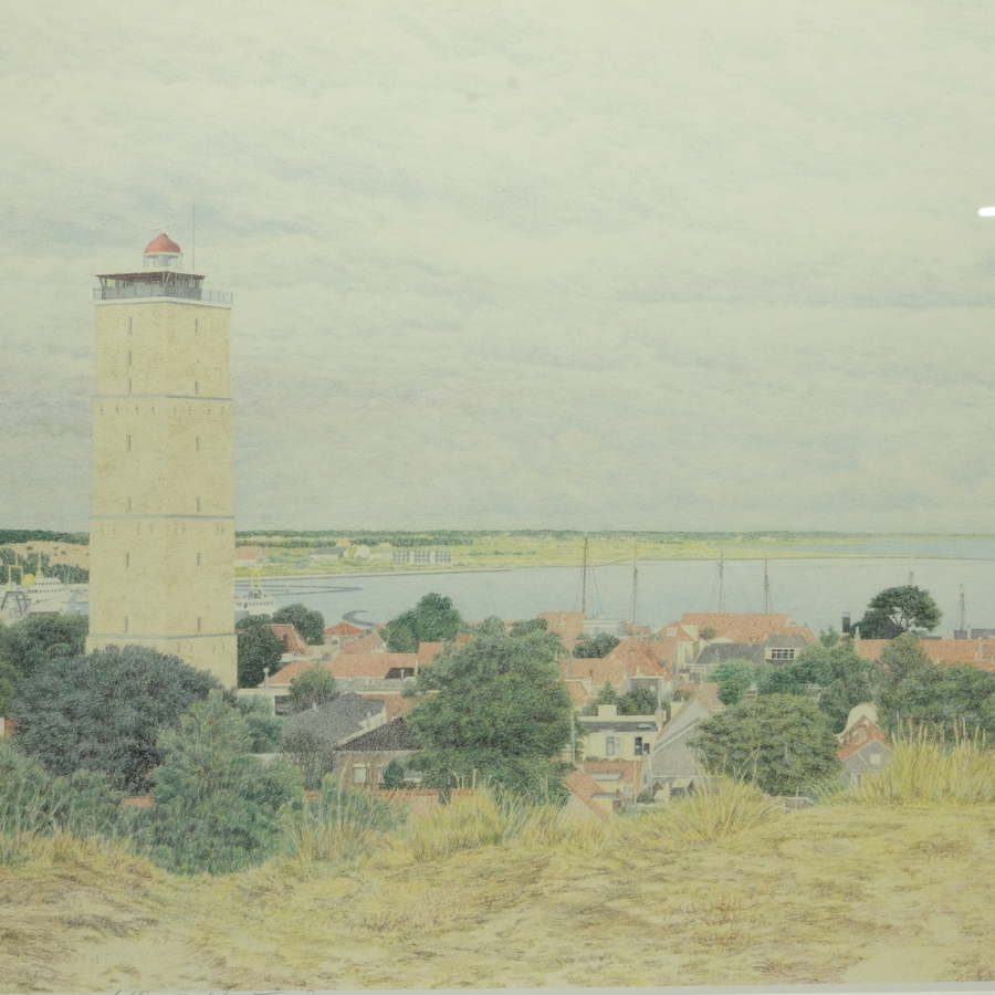 Zeefdruk. Voorstelling van de Brandaris op Terschelling. Linksonder gesigneerd Frans Room (Wormer 1923-2023), gedateerd 2000. Oplage 60/150.