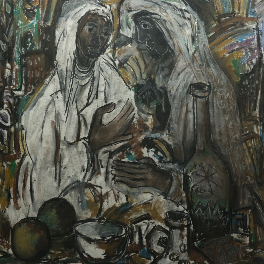 Gemengde techniek. Voorstelling van twee figuren op een markt in het Midden-Oosten. Linksboven gesigneerd Jelle Hoogstra (Leeuwarden 1924 – Rotterdam 2003).