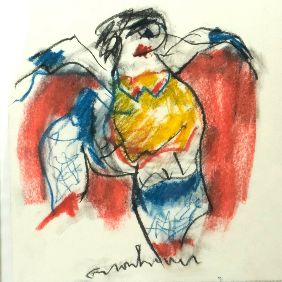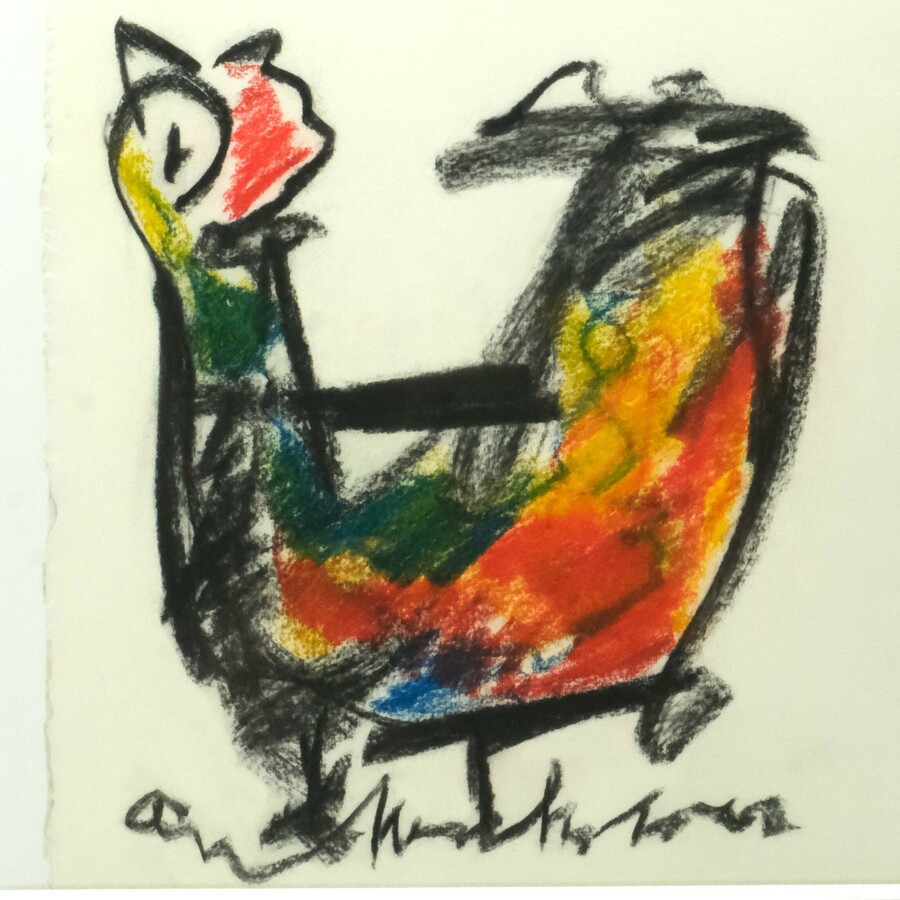 Krijttekening op papier. Grote kip in zwart, rood en geel, ca. 1990.