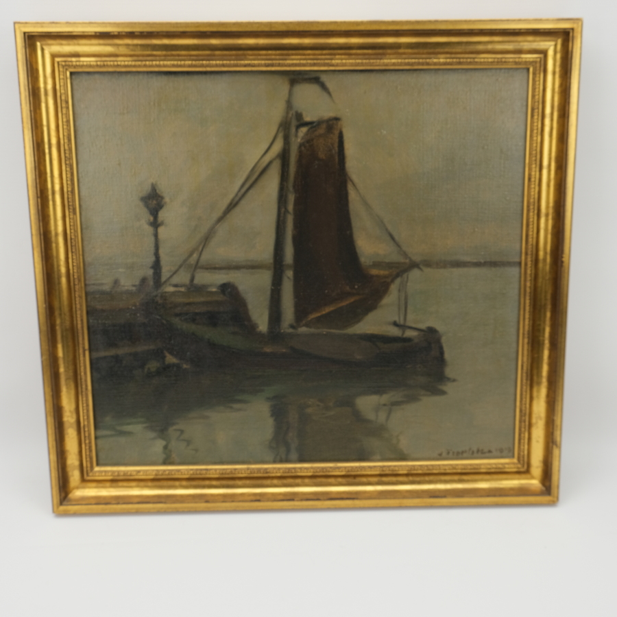 Schilderij, olieverf op doek. Zeilpraam in de haven. Rechtsonder gesigneerd Jelle Troelstra (Leeuwarden 1891 - Amersfoort 1979), gedateerd 1919