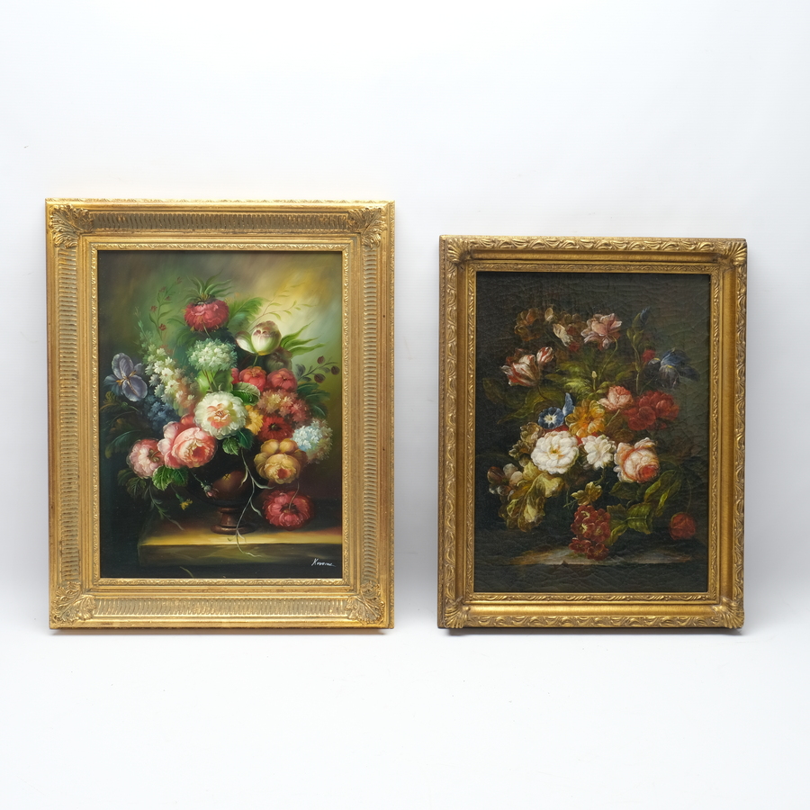Twee schilderijen, olieverf op doek en paneel. Voorstellingen van bloemstillevens. Eén gesigneerd Bijlsma, één gesigneerd Avoine.