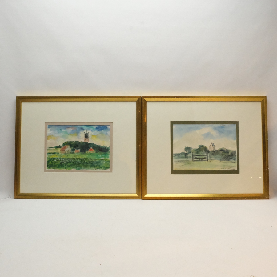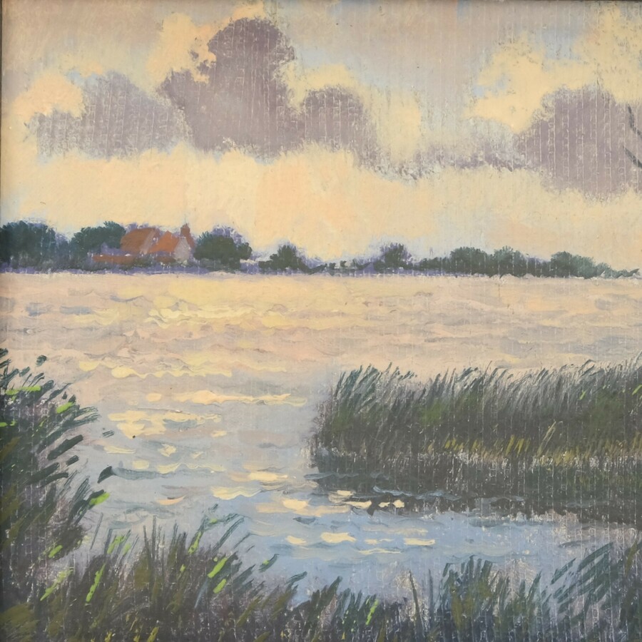 Schilderij, marouflé. Gezicht op een meer, vermoedelijk in de buurt van Workum. Rechtsonder gesigneerd Piet Schoen (Bergen 1909 – Gouda 1985)
