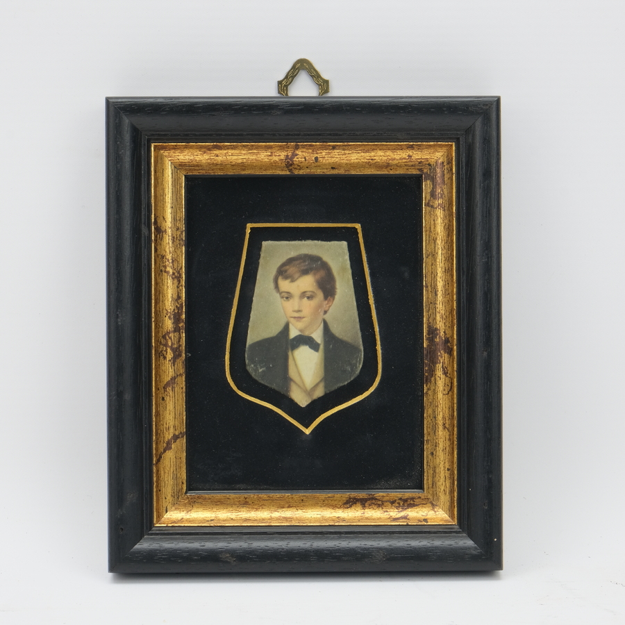 Miniatuurportretje, voorstelling van de heilige Domenico Savio, gedrukt op zijde. Italie, ca. 1900.