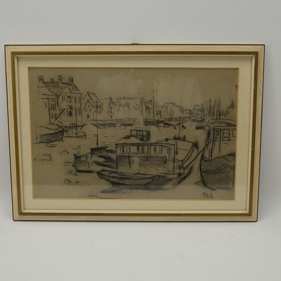 Potloodtekening op papier. De Noorderhaven en het stadhuis van Harlingen. Rechtsonder gesigneerd Piet Hein van Asperen (Harlingen 1895 - Leeuwarden 1969)