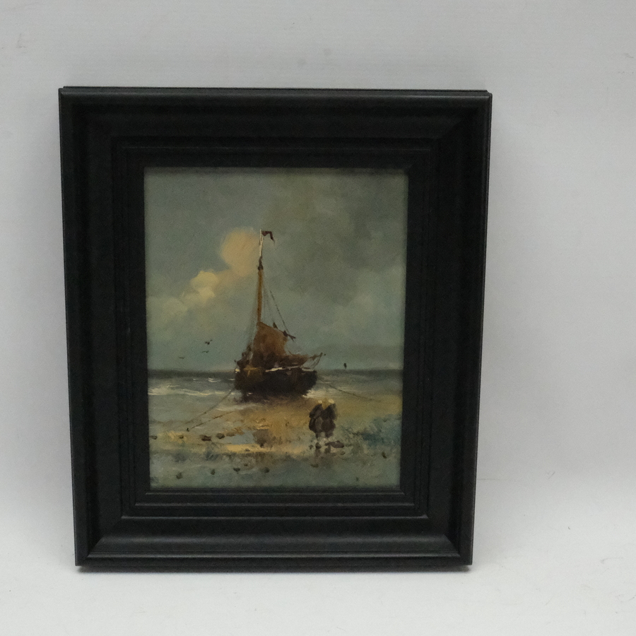Schilderij, olieverf op paneel 25 x 20 cm in zwarte profiellijst 34,5 x 29 cm. Bomschuit op het strand met twee figuren. Rechtsonder gesigneerd Harry van Dongen (1909)