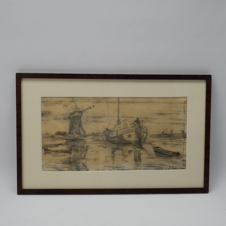 Tekening, potlood op papier. Schip bij molen. Rechtsonder gesigneerd Johannes Lussenburg (Enkhuizen 1889 – Nunspeet 1975)