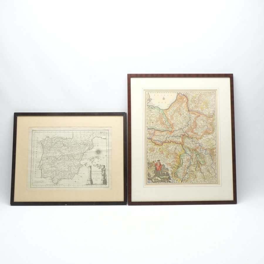 Lot van twee kaarten: een 20e eeuwse kaart van Gelderland, kopie naar een oude kaart. Met daarbij een 18e eeuwse kaart van Spanje, 'L 'Espagne pour l' intelligence de l'histoire Romaine de M. St...
