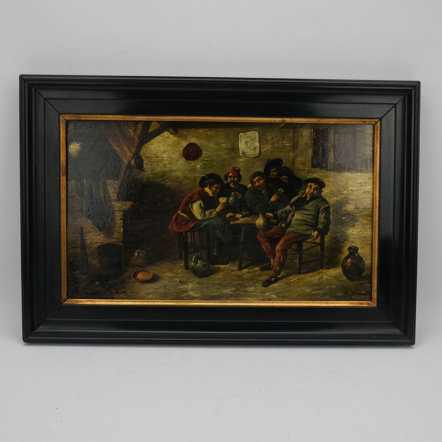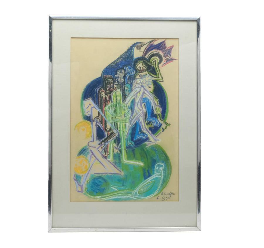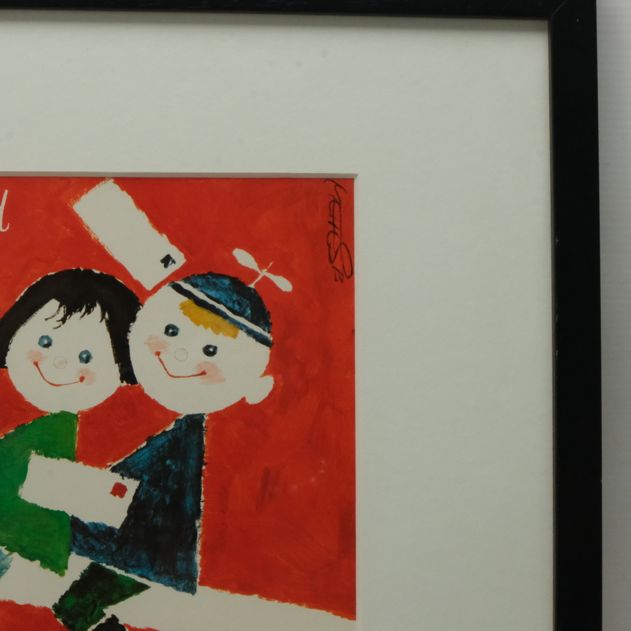 Lot van drie wanddecoraties: schilderij, portret, gesigneerd 'Jean', schilderij, schepen, gesigneerd 'Frits Garretsen en een kopie van affiche, Kinderpostzegels