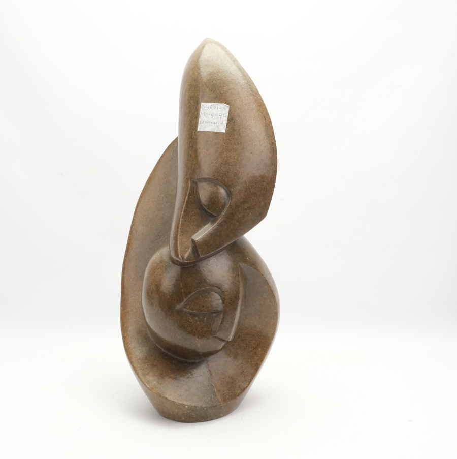 Een zwaar Afrikaans stenen sculptuur, voorstelling van twee gezichten. Gesigneerd Skebios