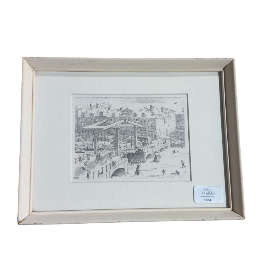 Ets, winterlandschap op de gracht. Linksonder gesigneerd Engelina Reitsma-Valenca (1889-1981)