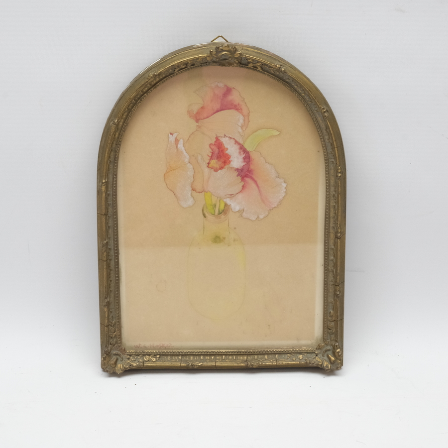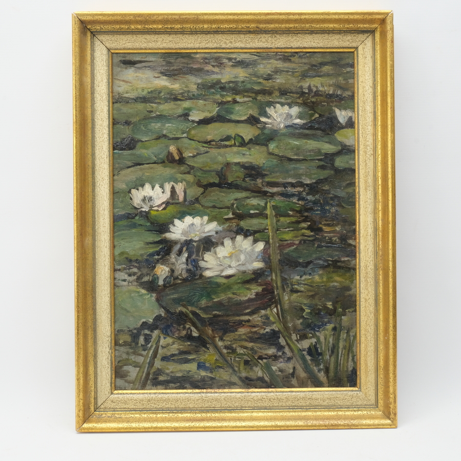 Schilderij, olieverf op paneel. Voorstelling van waterlelies.