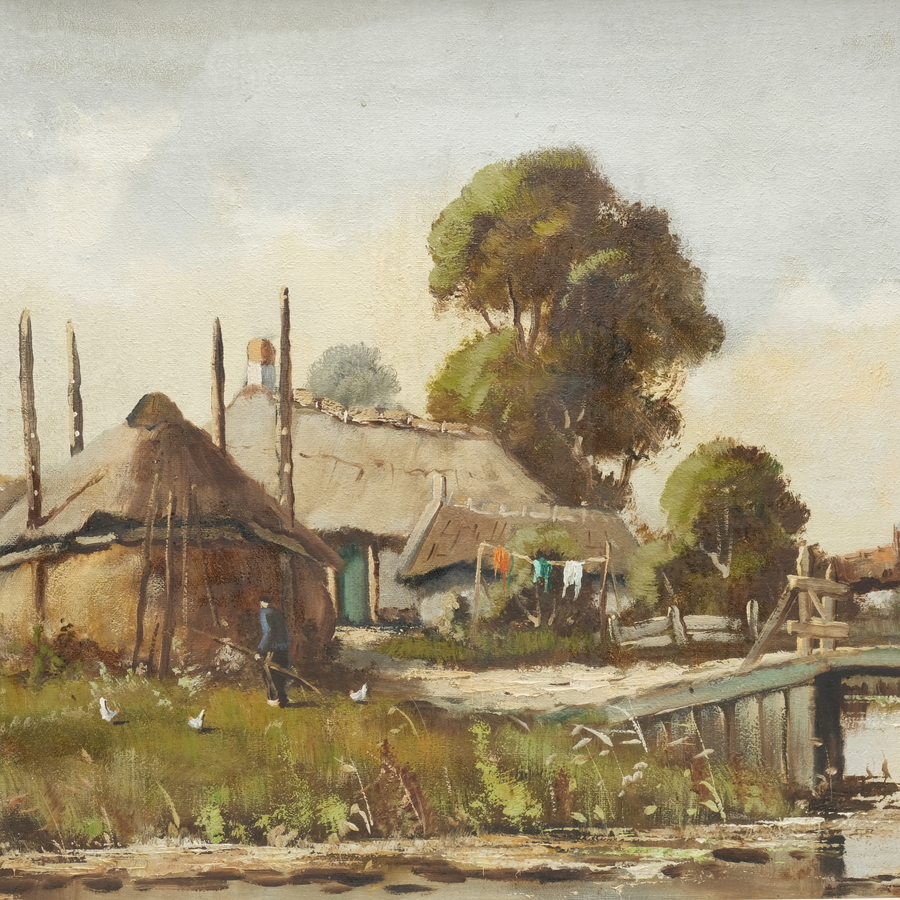 Schilderij, olieverf op doek in witte profiellijst. Boerderij aan de vaart met hooischuur en boer met kippen. Rechtsonder gesigneerd W. Th. La Grand.