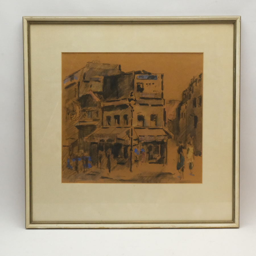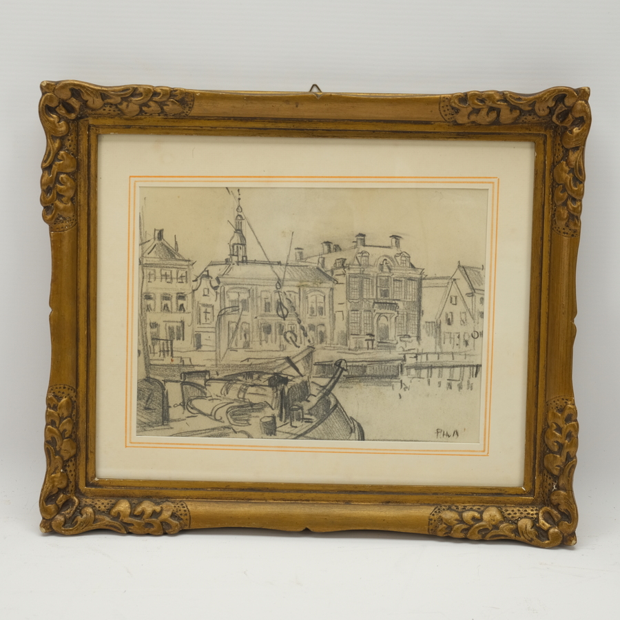 Potloodtekening op papier. Gezicht op het Stadhuis van Harlingen. Rechtsonder gesigneerd Piet Hein van Asperen (Harlingen 1895 - Leeuwarden 1969)
