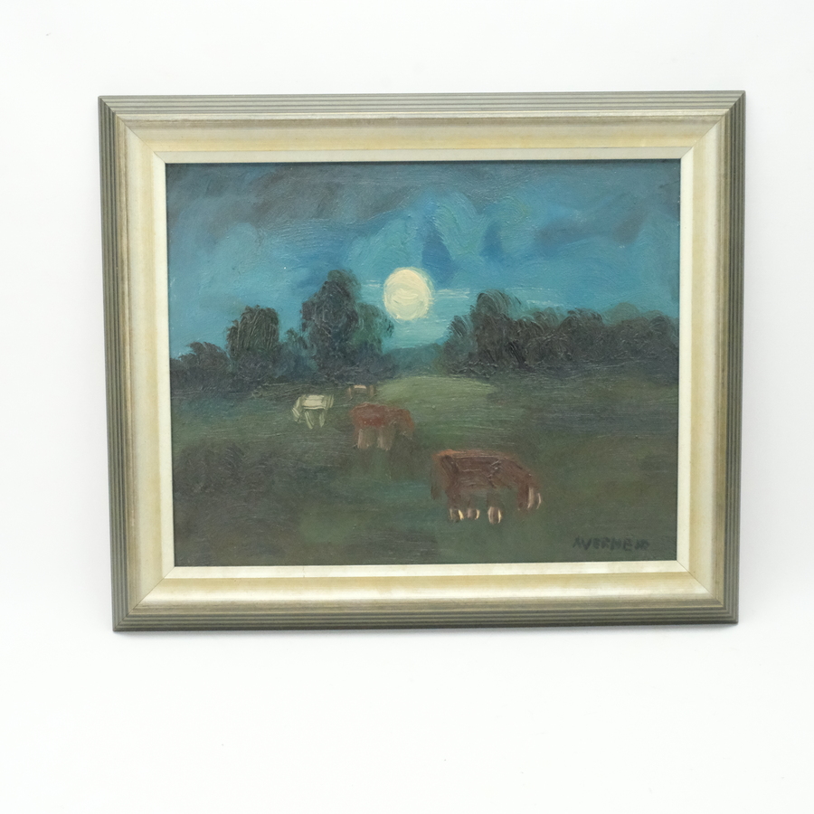 Schilderij, olieverf op doek. Paarden in het licht van de maan. Linksonder gesigneerd Alfons Vermeir (Baasrode (België) 1905-1994)