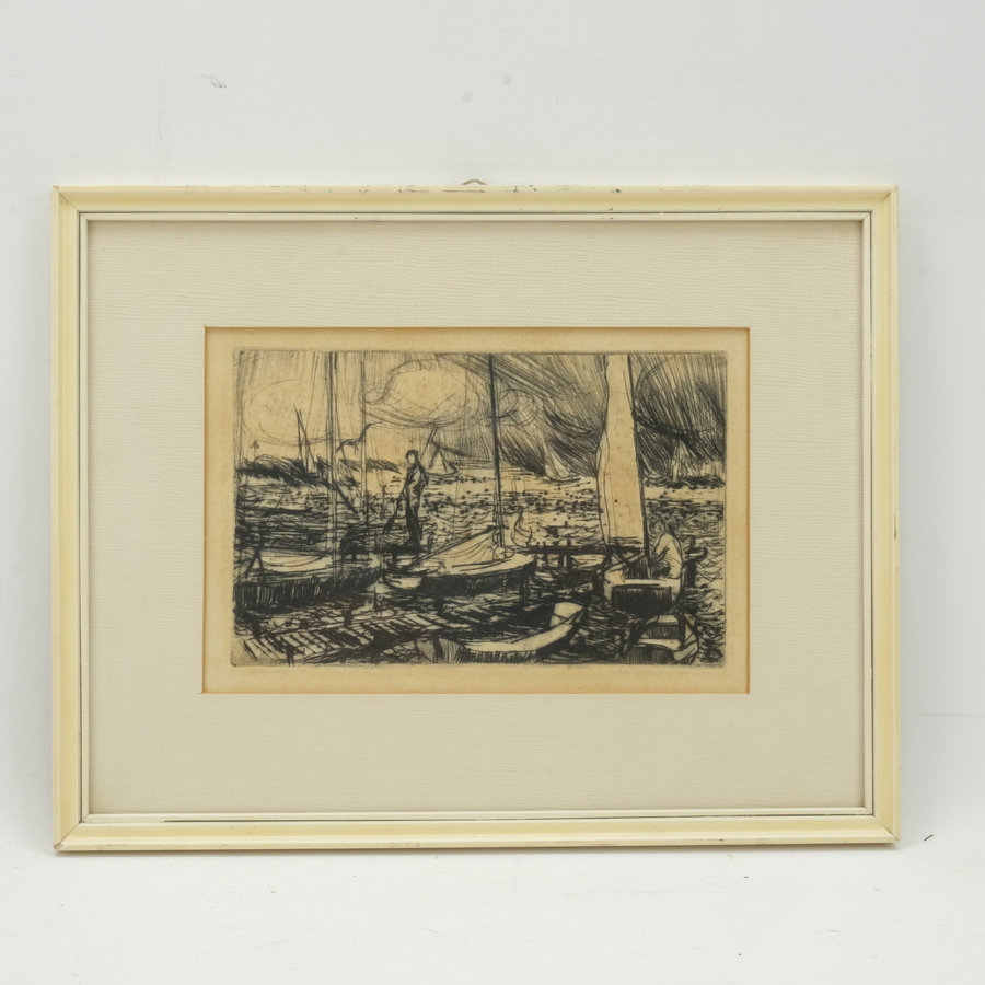 Ets. Zeilboten op het Sneekermeer. Rechtsonder gesigneerd Jan Stroosma (Leeuwarden 1923 - 1983).