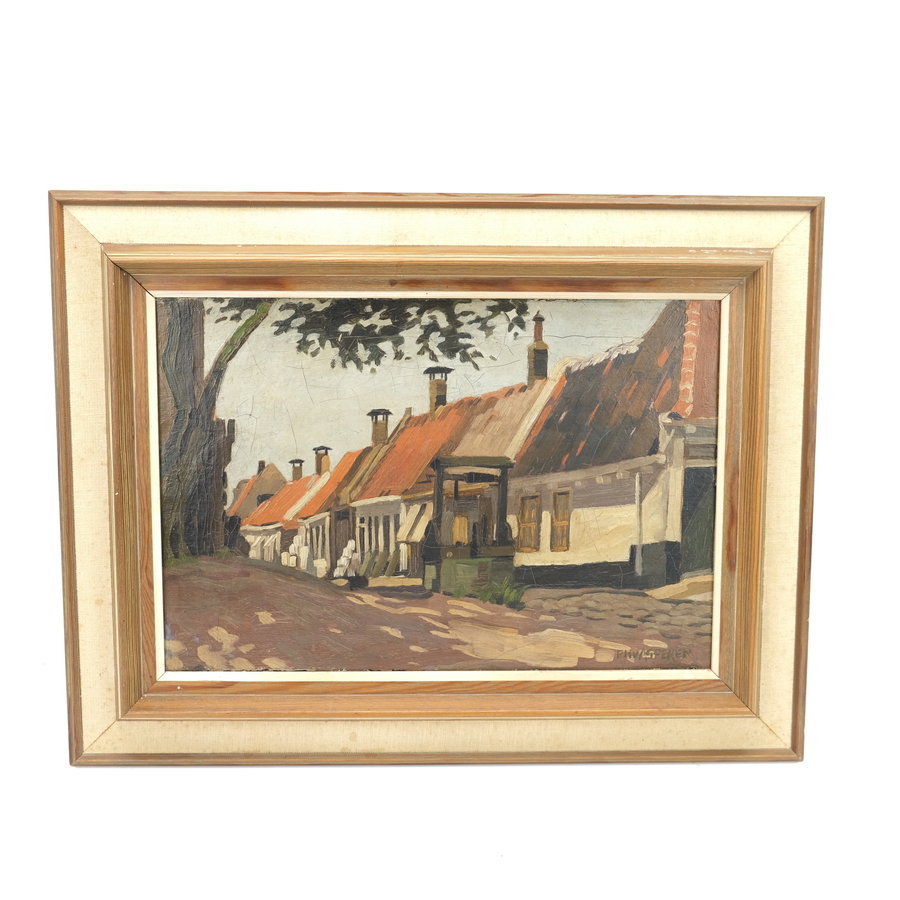 Schilderij, olieverf op doek. Huisjes bij een waterput. Rechtsonder gesigneerd Piet Hein van Asperen (Harlingen 1895 - Leeuwarden 1969).