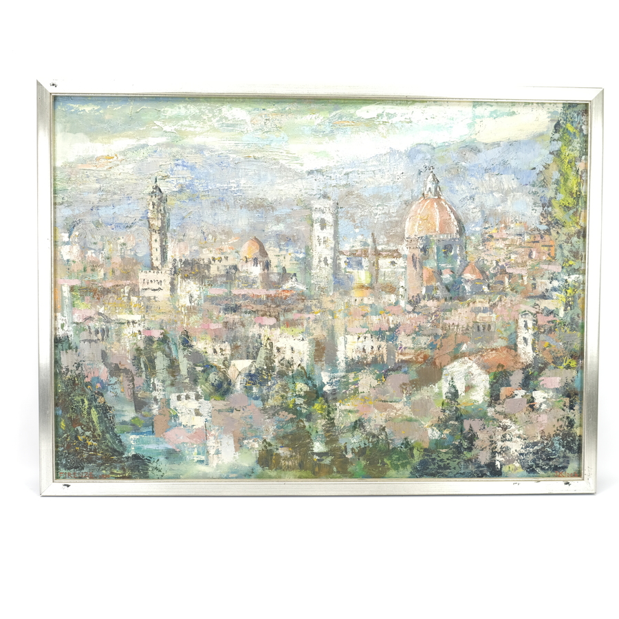 Schilderij, olieverf, marouflé. Gezicht op Firenze. Rechtsonder gesigneerd Joop Kloek (Oudelande 1912 - Zwolle 1992), gedateerd 1970.