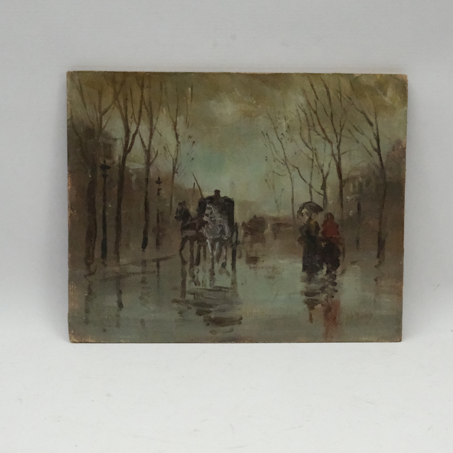Schilderij, marouflé 24 x 30 cm. Koets en figuren in het park. Rechtsonder gesigneerd, Hollandse School 20e eeuw
