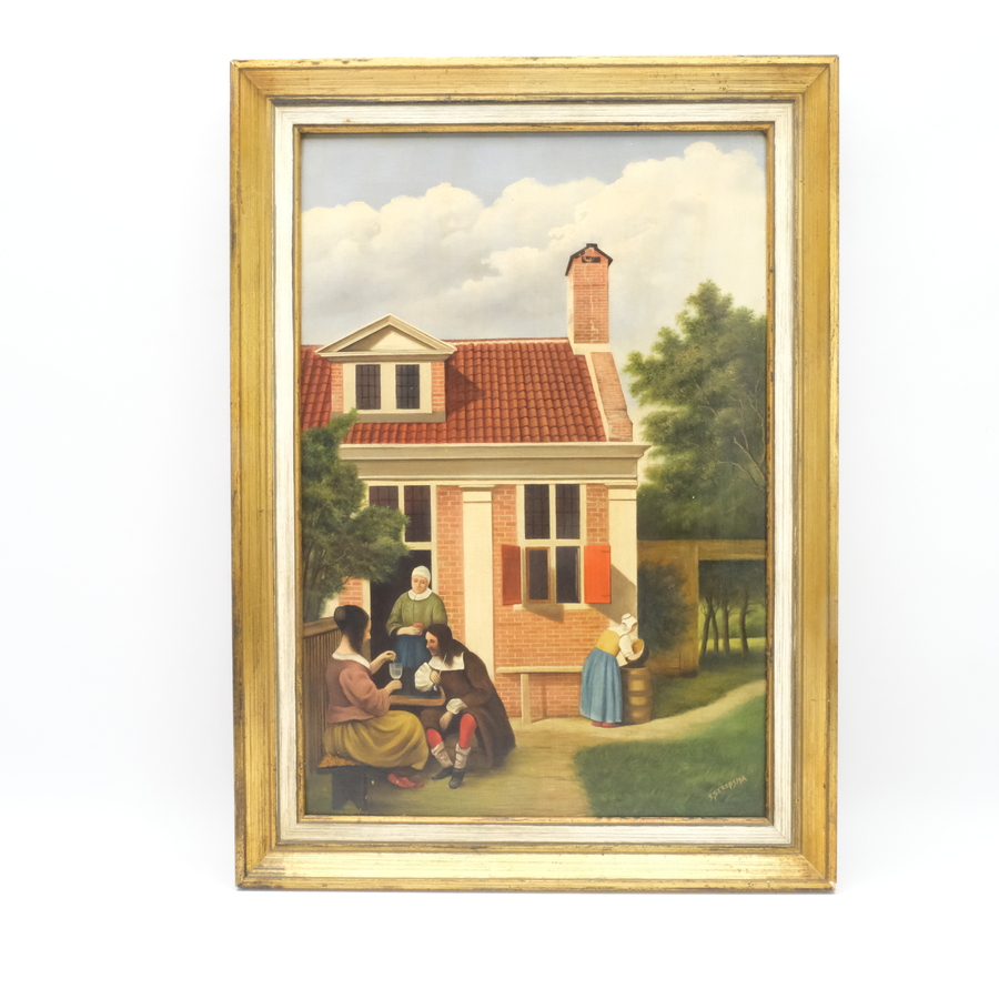 Schilderij, olieverf op doek. Kopie naar het schilderij ‘het buitenhuis’ van Pieter de Hooch (1629-1683). Rechtsonder gesigneerd Jan D. Stropsma (Joure 1881 – Scharsterbrug 1955)