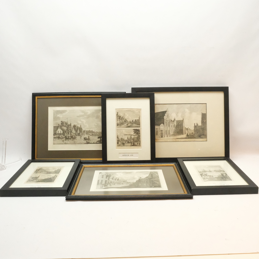 Lot van 6 18e eeuwse kopergravures met voorstellingen van Heeg, Akrum, Leeuwarden, Woudsend en Sneek