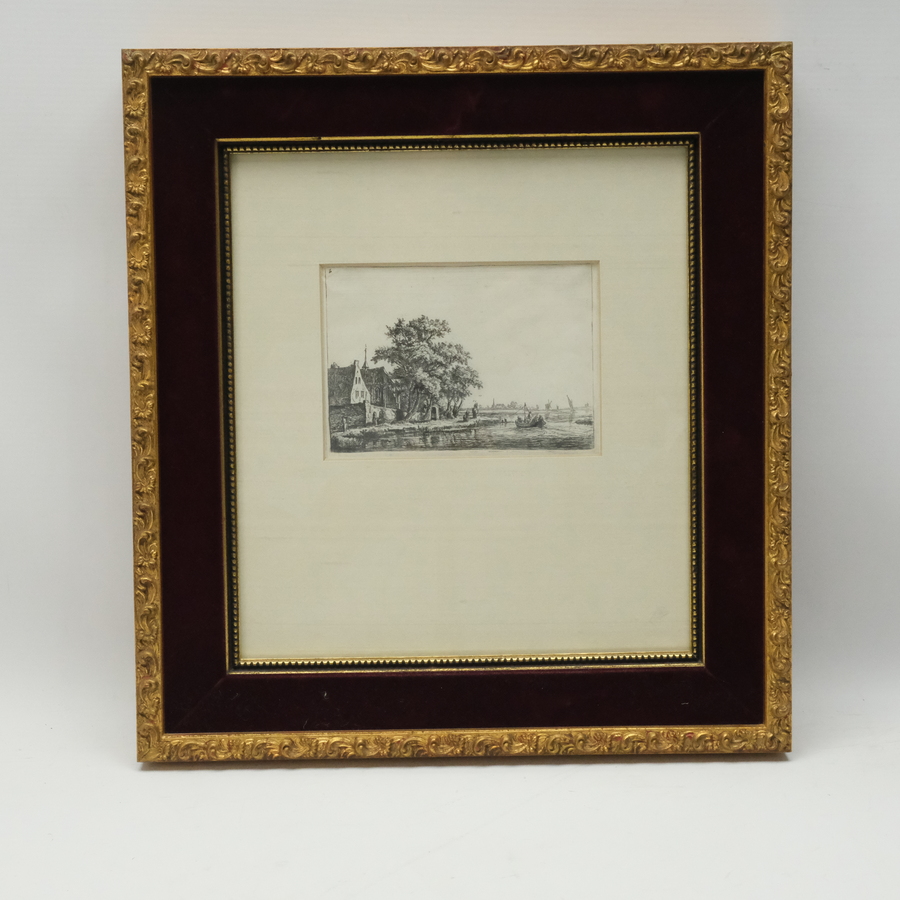Ets, kerk aan de waterkant, met een trekschip in de vaart. Ongesigneerde ets van Anthonie Waterloo (Lille 1609 - Utrecht 1690)