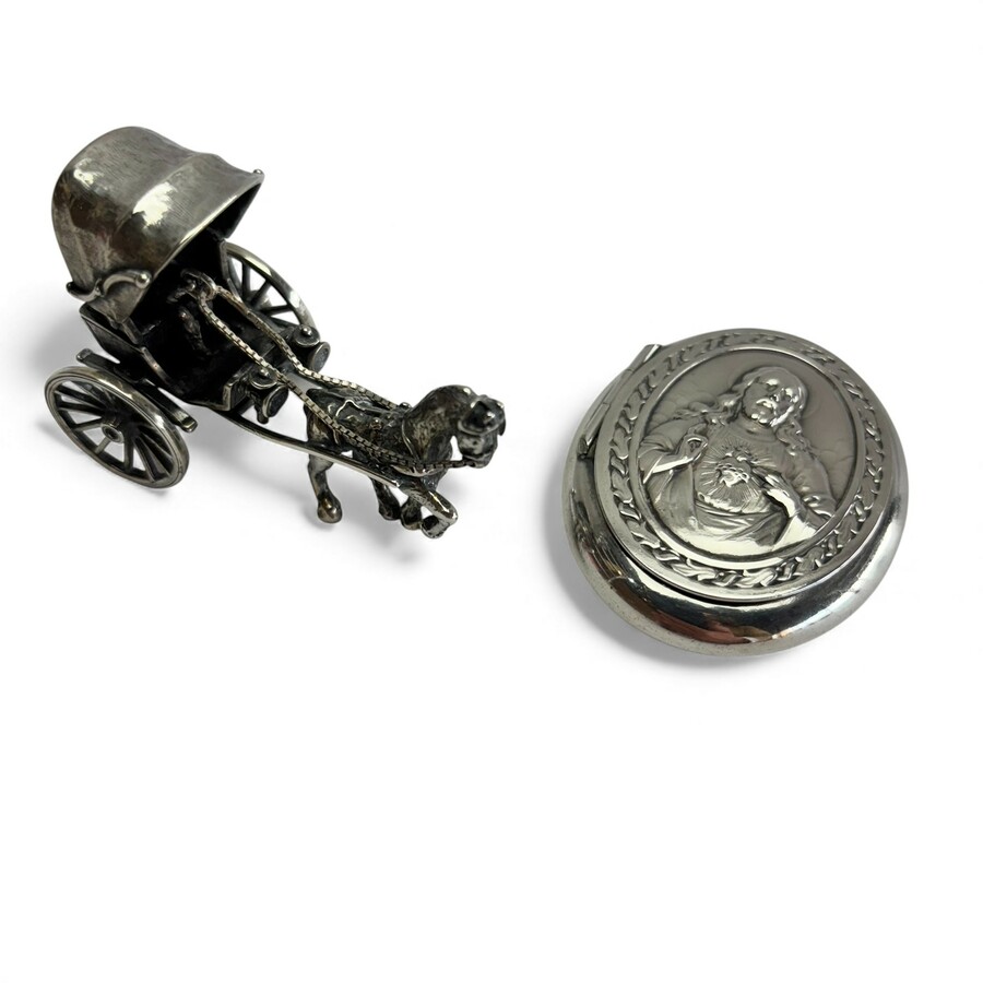 Zilveren miniatuur rijtuig en verzilverd rozenkransdoosje