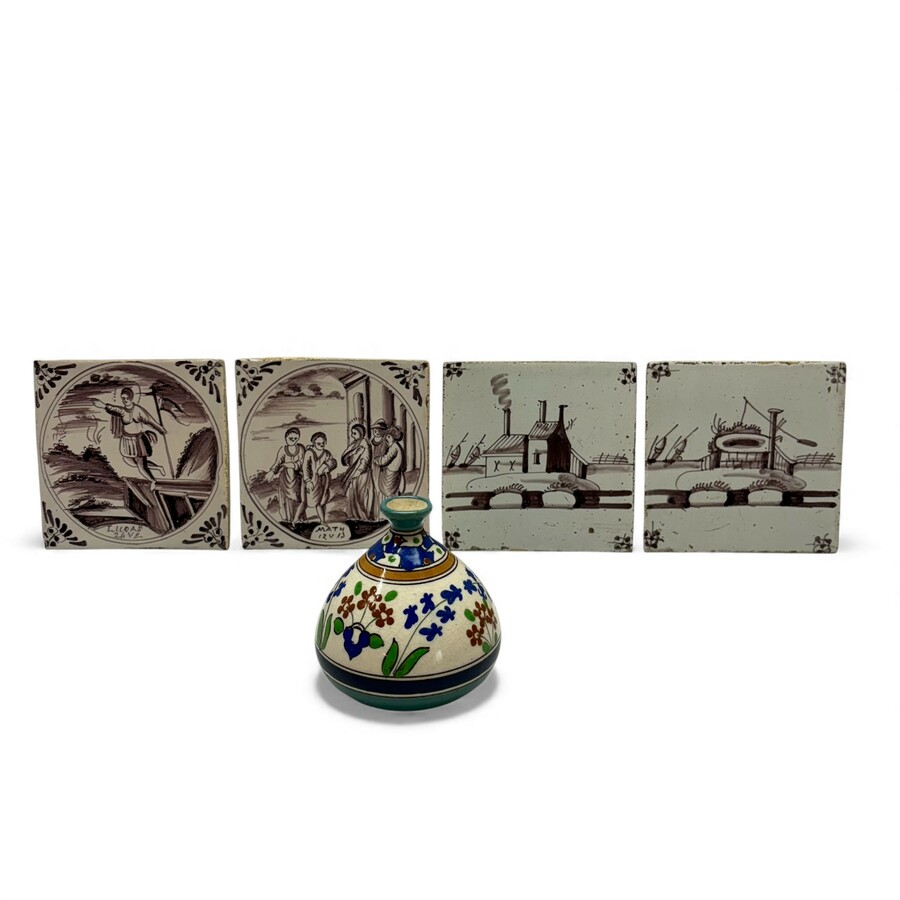 Lot van vier 19e eeuwse mangaan tegels en Arnhem vaasje