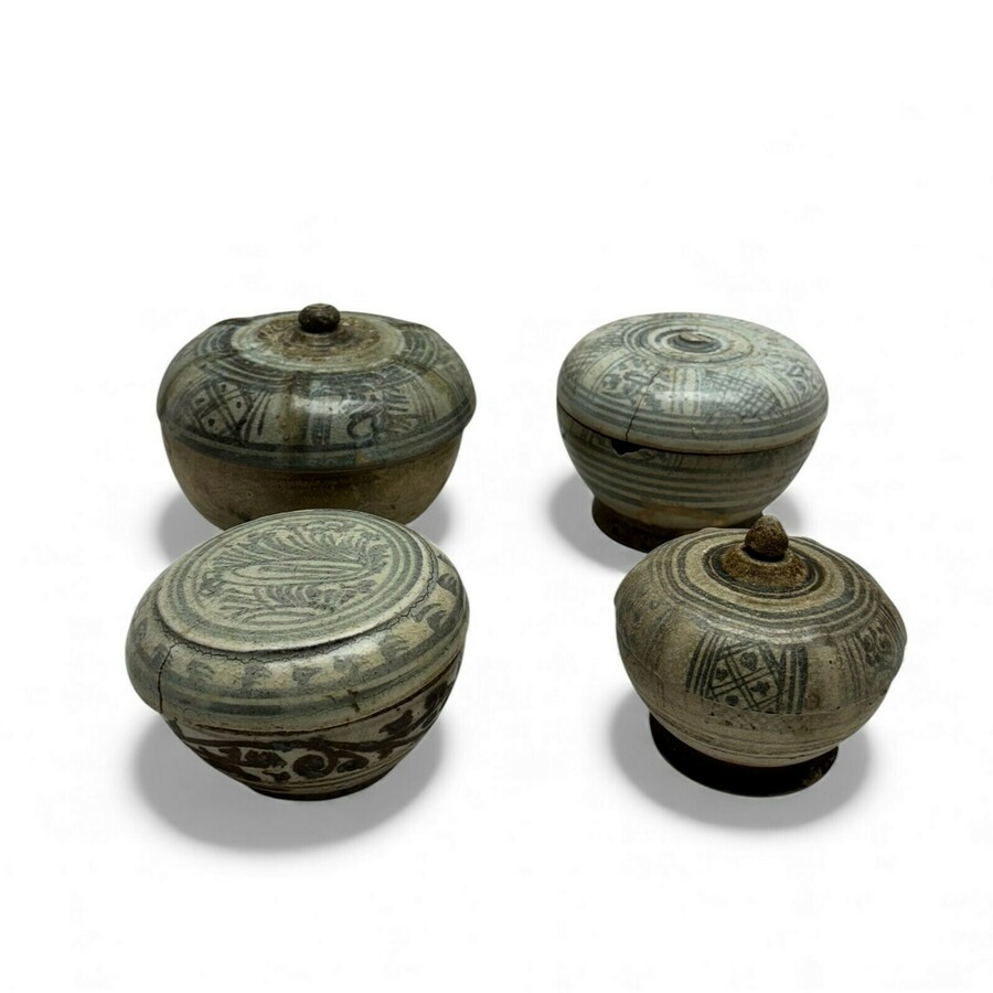 Lot van vier stuks Thaise Sawankhalok aardewerken ronde dekseldoosjes.
